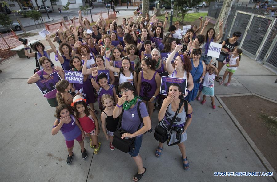 Mujeres posan para una fotografía luego del evento "El 3M caminamos, el 8M paramos", en Buenos Aires, capital de Argentina, el 3 de marzo de 2018. De acuerdo con información de la prensa local, esta actividad, que incluyó una caminata y la lectura de poesía feminista, se realizó en el marco del Paro Internacional de Mujeres, que se realizará el próximo 8 de marzo en distintas ciudades alrededor del mundo. (Xinhua/Martín Zabala)