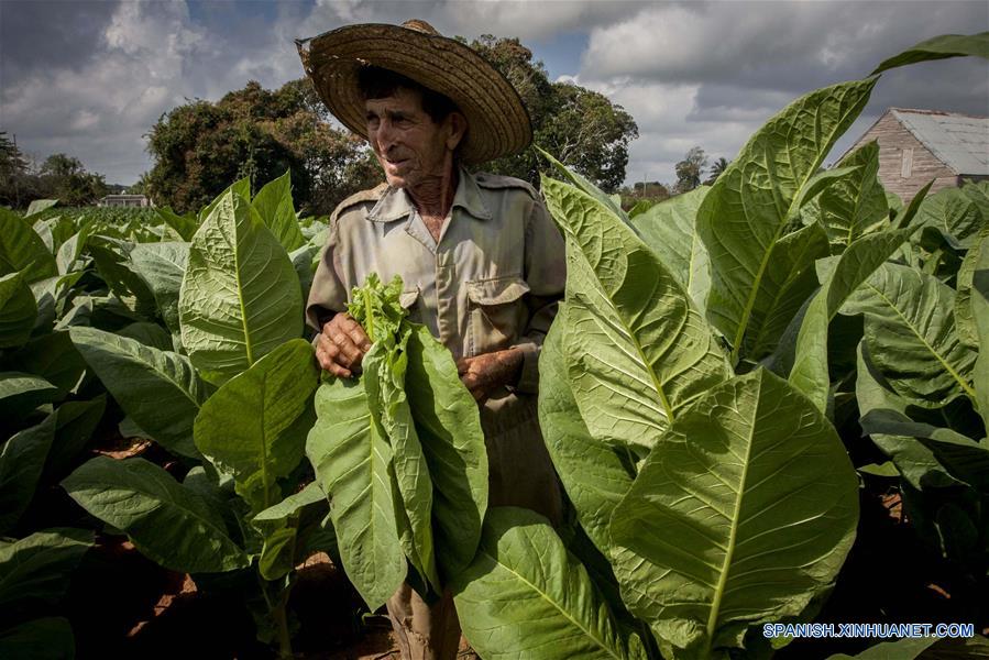 Imagen del 28 de febrero de 2017, de un hombre cosechando hojas de tabaco, en la provincia de Pinar del Río, Cuba. Cuba espera aumentar este a?o la superficie sembrada de tabaco para incrementar la elaboración de habanos, el más global de los productos manufacturados en la isla, y cuya exportación reporta unos 400 millones de dólares estadounidenses anuales. "Sembramos en la pasada campa?a alrededor de 28,000 hectáreas de tabaco, y en esta campa?a 2017-2018, en la cual estamos plantando todavía, pensamos llegar a las 29.600 hectáreas", dijo a la prensa local el presidente del estatal Grupo Empresarial del Tabaco (Tabacuba), Justo Luis Fuentes. (Xinhua/Joaquín Hernández)