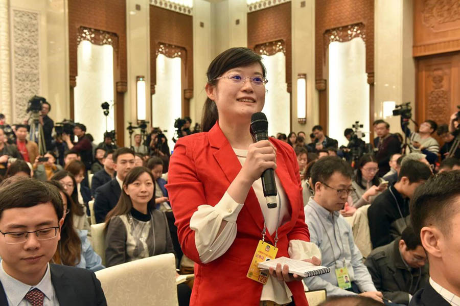 Una periodista de Diario del Pueblo pregunta al portavoz de la primera sesión de la XIII Conferencia Consultiva Política del Pueblo Chino (CCPPCh) en una rueda de prensa, el 2 de marzo de 2018. (Lei Sheng / Diario del Pueblo)