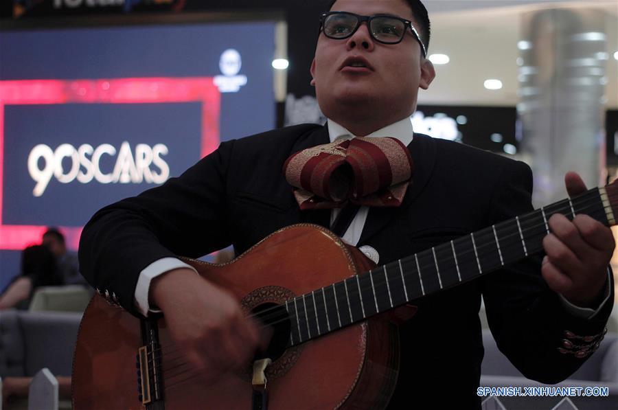 GUADALAJARA, marzo 4, 2018 (Xinhua) -- Un joven toca una guitarra durante la transmisión de la 90 ceremonia de entrega de los Premios de la Academia de las Artes y las Ciencias Cinematográficas, en un centro comercial, en Guadalajara, estado de Jalisco, México, el 4 de marzo de 2018. El director mexicano, Guillermo del Toro, obtuvo el Premio Oscar a Mejor Director, por la película "La Forma del Agua". (Xinhua/Bernardette Gómez)