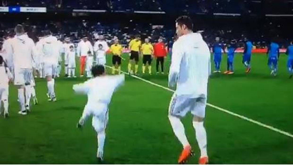 El peque?o no podía ocultar su alegría por vivir ese momento. Saludó e incluso imitó a Cristiano cuando éste hizo un rápido ejercicio de calentamiento acompa?ado de su habitual salto.