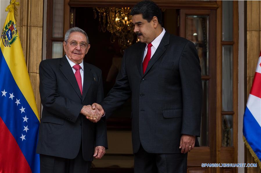 El presidente venezolano, Nicolás Maduro (d), estrecha la mano con su homólogo de Cuba, Raúl Castro (i), en el marco de la apertura de la XV Cumbre de la Alianza Bolivariana para los Pueblos de Nuestra América (ALBA-TCP), en el Palacio de Miraflores, en Caracas, Venezuela, el 5 de marzo de 2018. El presidente de Venezuela, Nicolás Maduro, defendió el lunes su "lealtad" al fallecido mandatario, Hugo Chávez (1999-2013), en la apertura de la XV Cumbre de la Alianza Bolivariana para los Pueblos de Nuestra América (ALBA-TCP). Durante una concentración con seguidores chavistas a las afueras del Palacio Presidencial de Miraflores, Maduro recordó a Chávez, uno de los fundadores de la ALBA, quien falleció el 5 de marzo de 2013. (Xinhua/Str)
