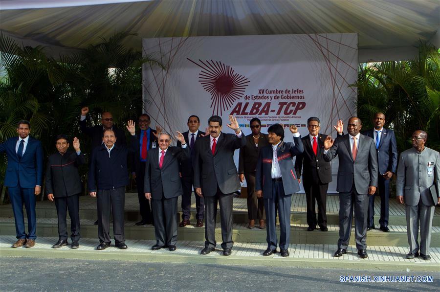 El presidente venezolano, Nicolás Maduro (4-d-frente), y sus homólogos de Nicaragua, Daniel Ortega (3-i-frente), de Cuba Raúl Castro (4-i-frente), y de Bolivia Evo Morales (3-d-frente), posan durante la apertura de la XV Cumbre de la Alianza Bolivariana para los Pueblos de Nuestra América (ALBA-TCP), en el Palacio de Miraflores, en Caracas, Venezuela, el 5 de marzo de 2018. El presidente de Venezuela, Nicolás Maduro, defendió el lunes su "lealtad" al fallecido mandatario, Hugo Chávez (1999-2013), en la apertura de la XV Cumbre de la Alianza Bolivariana para los Pueblos de Nuestra América (ALBA-TCP). Durante una concentración con seguidores chavistas a las afueras del Palacio Presidencial de Miraflores, Maduro recordó a Chávez, uno de los fundadores de la ALBA, quien falleció el 5 de marzo de 2013. (Xinhua/Str)