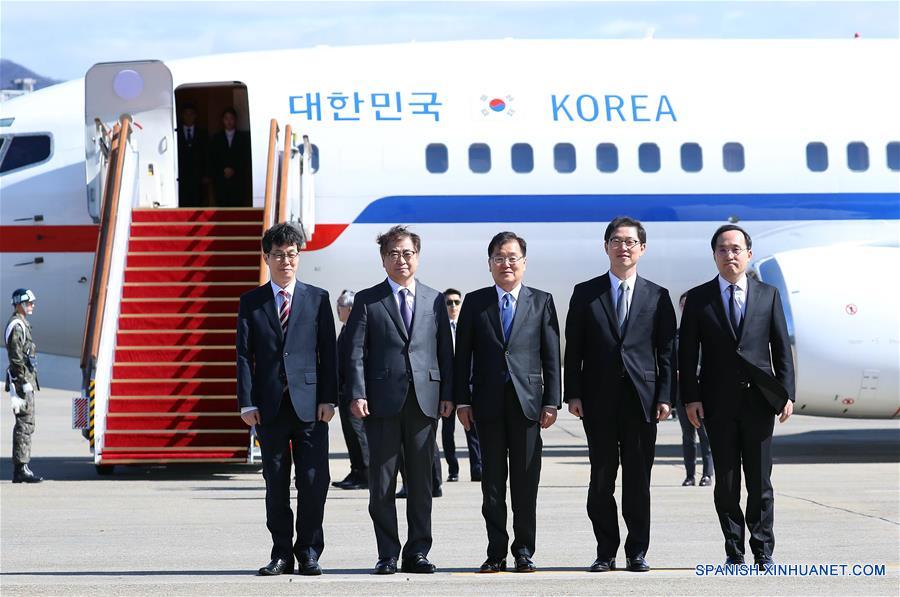 Chung Eui-yong (c), el máximo asesor en temas de seguridad del presidente de República de Corea, Moon Jae-in, y cabeza de la Oficina de Seguridad Nacional de la Casa Azul, y otros delegados posan para una fotografía grupal previo a su salida del aeropuerto en Seúl, República de Corea, el 5 de marzo de 2018. La delegación de enviados especiales del presidente surcoreano, Moon Jae-in, que tratará de negociar conversaciones entre Estados Unidos y República Popular Democrática de Corea (RPDC) partió el lunes desde Seúl rumbo a Pyongyang. La comitiva, que además de los cinco emisarios está integrada también por cinco funcionarios a nivel de trabajo, está encabezada por Chung Eui-yong, máximo asesor de seguridad nacional de Moon Jae-in y director de la Oficina de Seguridad Nacional de la presidencial Casa Azul. Los otros cuatro enviados especiales son Suh Hoon, director del Servicio Nacional de Inteligencia (SNI); Chun Hae-sung, viceministro de Unificación; Kim Sang-gyun, subdirector segundo del SNI, y Yun Kun-young, alto cargo de la Casa Azul. (Xinhua/Newsis)