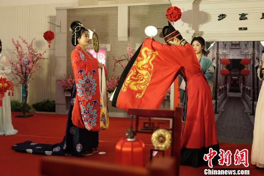 Recreación de una ceremonia de boda al estilo de la dinastía Tang durante una feria popular, organizada por el Centro de Arte de Shanghai con motivo del Festival de los Faroles, 3 de marzo del 2018. [Foto: Chinanews.com]