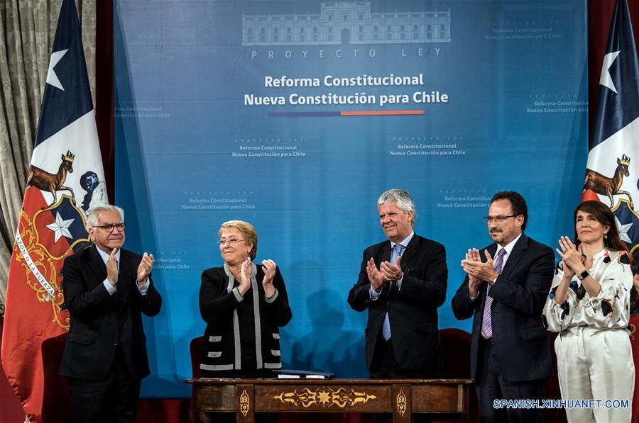 La presidenta de Chile, Michelle Bachelet (2-i), aplaude después la firma del proyecto de Ley de Reforma Constitucional que establece una Nueva Constitución para Chile, en el Palacio de La Moneda, en Santiago, capital de Chile, el 6 de marzo de 2018. La presidenta de Chile, Michelle Bachelet, presentó y firmó el martes en el Palacio de La Moneda en Santiago el proyecto de Ley de Reforma Constitucional que establece una Nueva Constitución para Chile, instancia que deberá ser analizada por el Congreso para su aprobación, a sólo seis días de entregar el poder, de acuerdo con información de la prensa local. (Xinhua/Jorge Villegas)