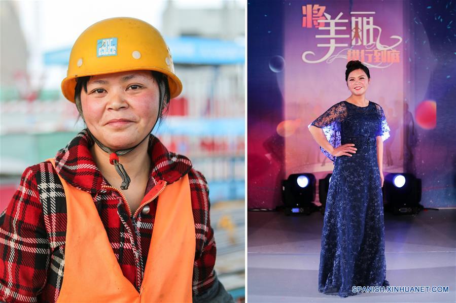 SHAANXI, marzo 7, 2018 (Xinhua) -- Imagen combinada del 6 de marzo de 2018 del retrato de la trabajadora de la construcción Liu Huaying portando su uniforme en un sitio de construcción en Xi'an, provincia de Shaanxi, en el noroeste de China (i), y presentando un vestido durante un desfile de moda llevado a cabo para celebrar el próximo Día Internacional de la Mujer, en Xi'an, provincia de Shaanxi, en el noroeste de China (d). (Xinhua/Str)
