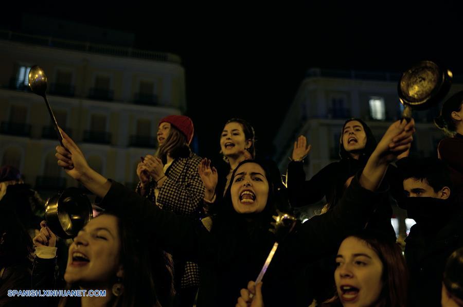 MADRID, marzo 8, 2018 (Xinhua) -- Mujeres golpean ollas y sartenes mientras gritan consignas durante la cacerolada (protesta de golpeo de ollas) llevada a cabo en el marco del Día Internacional de la Mujer en la Plaza del Sol en Madrid, capital de Espa?a, el 8 de marzo de 2018. Espa?a celebra el jueves la primer huelga general feminista de su historia en un Día Internacional de la Mujer marcado por un informe de la Fundación de Estudios de Economía Aplicada (Fedea) que se?ala que las mujeres cobran un 13 por ciento menos por hora que los hombres por hacer trabajos similares. La huelga convocada para el jueves no limita sus peticiones a la igualdad de salarios, sino que también es una protesta frente a la violencia machista (48 mujeres asesinadas por sus parejas en 2017 y 916 desde que se empezaron a medir estos datos, en 2003). (Xinhua/Juan Carlos Lucas/NurPhoto/ZUMAPRESS)