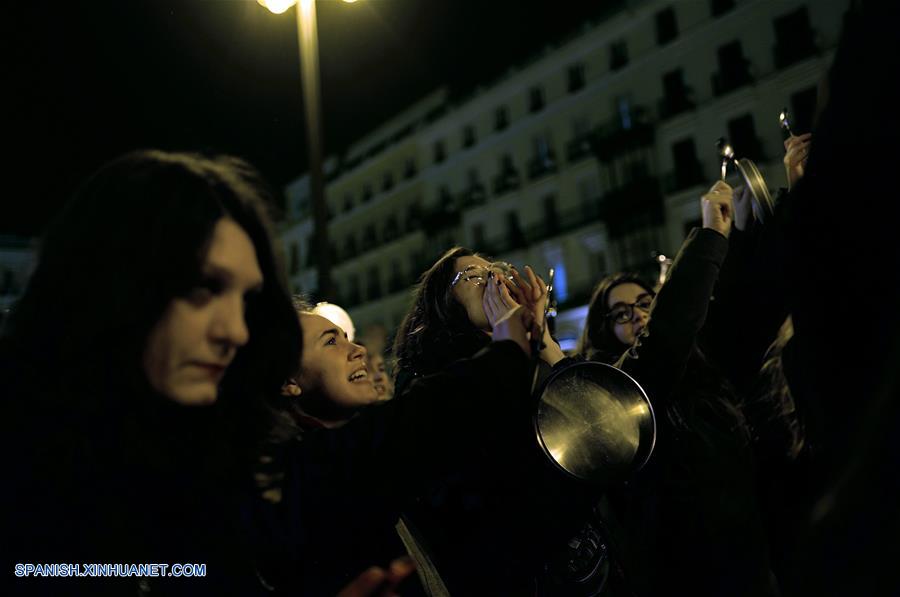 MADRID, marzo 8, 2018 (Xinhua) -- Mujeres golpean ollas y sartenes mientras gritan consignas durante la cacerolada (protesta de golpeo de ollas) llevada a cabo en el marco del Día Internacional de la Mujer en la Plaza del Sol en Madrid, capital de Espa?a, el 8 de marzo de 2018. Espa?a celebra el jueves la primer huelga general feminista de su historia en un Día Internacional de la Mujer marcado por un informe de la Fundación de Estudios de Economía Aplicada (Fedea) que se?ala que las mujeres cobran un 13 por ciento menos por hora que los hombres por hacer trabajos similares. La huelga convocada para el jueves no limita sus peticiones a la igualdad de salarios, sino que también es una protesta frente a la violencia machista (48 mujeres asesinadas por sus parejas en 2017 y 916 desde que se empezaron a medir estos datos, en 2003). (Xinhua/Juan Carlos Lucas/NurPhoto/ZUMAPRESS)