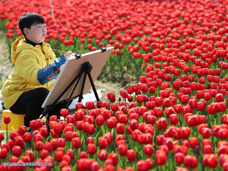 ZHEJIANG, marzo 10, 2018 (Xinhua) -- Un ni?o pinta entre tulipanes en la ciudad de Wenling, en la provincia de Zhejiang, en el este de China, el 10 de marzo de 2018. Residentes locales pasan sus fines de semana en el exterior para disfrutar los paisajes de primavera mientras las temperaturas suben. (Xinhua/Zhou Xuejun)