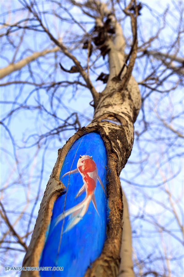 NINGXIA, marzo 10, 2018 (Xinhua) -- Vista de un dibujo pintado en un árbol en el parque Phoenix, en la ciudad de Yinchuan, en la Región Autónoma Hui de Ningxia, en el noroeste de China, el 10 de marzo de 2018. (Xinhua/Sui Xiankai)