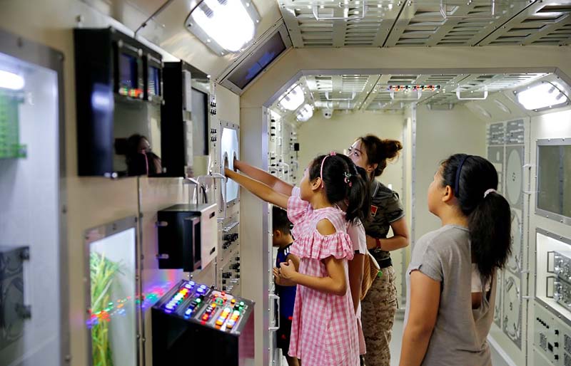 Los ni?os interactúan con aparatos aeroespaciales en la base militar de ciencias aeroespaciales, en Qinhuangdao. Foto: Pueblo en Línea
