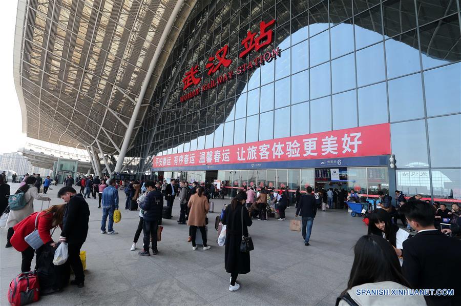 HUBEI, marzo 12, 2018 (Xinhua) -- Pasajeros permanecen frente a la Estación de Ferrocarriles de Wuhan, en Wuhan, en la provincia de Hubei, en el centro de China, el 12 de marzo de 2018. Este periodo, también conocido como "Chunyun", usualmente ve un incremento en el flujo de pasajeros por los 40 días por el Festival de Primavera. (Xinhua/Zhao Jun)