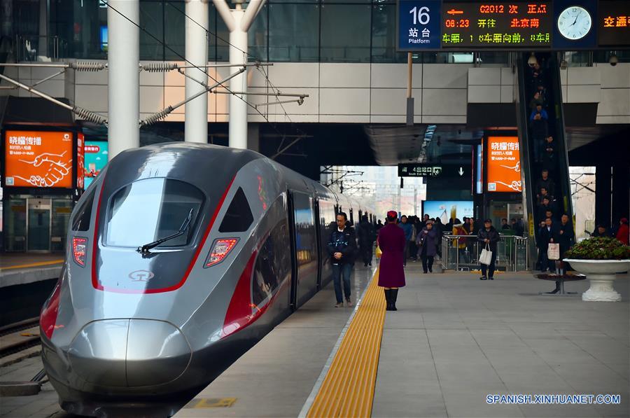 TIANJIN, marzo 12, 2018 (Xinhua) -- Personas abordan un tren de alta velocidad, en la Estación de Ferrocarriles de Tianjin, en Tianjin, en el norte de China, el 12 de marzo de 2018. Este periodo, también conocido como "Chunyun", usualmente ve un incremento en el flujo de pasajeros por los 40 días por el Festival de Primavera. (Xinhua/Yang Baosen)