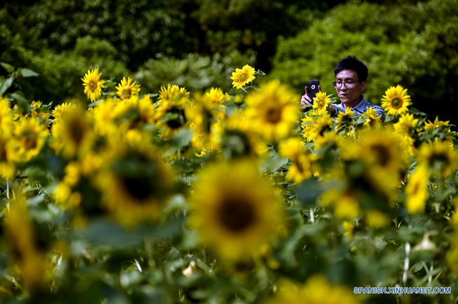 GUANGDONG, marzo 12, 2018 (Xinhua) -- Un hombre toma fotografías en un parque de girasoles cerca del Centro Cívico Shenzhen, en Shenzhen, en la provincia de Guangdong, en el sur de China, el 12 de marzo de 2018. (Xinhua/Mao Siqian)