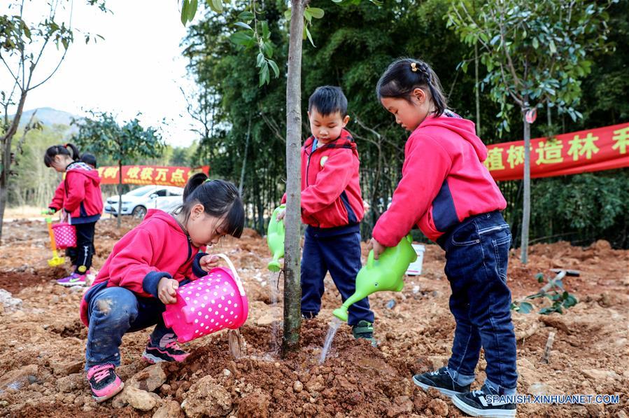 ZHEJIANG, marzo 12, 2018 (Xinhua) -- Ni?os riegan un árbol durante una actividad de plantación de árboles, en la aldea de Lijiaxiang, en el condado de Changxing, en la provincia de Zhejiang, en el este de China, el 12 de marzo de 2018. Una actividad de plantación de árboles dirigida a fomentar la conciencia de los ni?os sobre la protección del medio ambiente fue llevada a cabo el lunes en la aldea de Lijiaxiang. (Xinhua/Xu Xu)