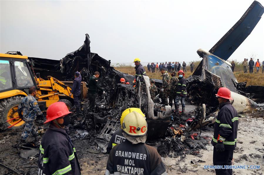 Rescatistas trabajan en el sitio donde un avión se estrelló al aterrizar, en Katmandú, Nepal, el 12 de marzo de 2018. Al menos 49 personas murieron y otras 17 resultaron heridas al estrellarse el lunes un avión de pasajeros de la US-Bangla Airlines en el Aeropuerto Internacional de Tribhuvan (TIA) de Nepal, confirmaron las autoridades. El avión Bombardier Dash Q-400, con 67 pasajeros y cuatro miembros de la tripulación a bordo, se estrelló durante el aterrizaje. El vuelo UBG211 estaba en camino a Katmandú desde la ciudad de Dhaka, en Bangladesh. (Xinhua/Sunil Sharma)