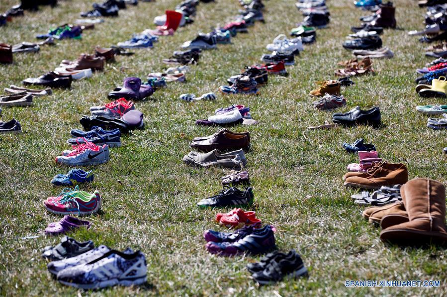 WASHINGTON, D.C., marzo 13, 2018 (Xinhua) -- Zapatos que representan a ni?os asesinados en tiroteos en escuelas desde el tiroteo en la Escuela Primaria Sandy Hook en 2012, permanecen en el césped frente al Capitolio, en Washington, D.C., Estados Unidos, el 13 de marzo de 2018. De acuerdo con información de la prensa local, un grupo de activistas colocó el martes 7,000 pares de zapatos en el césped frente al Congreso estadounidense, en protesta contra la inacción de los legisladores ante los frecuentes tiroteos en las escuelas en el país. (Xinhua/Ting Shen)