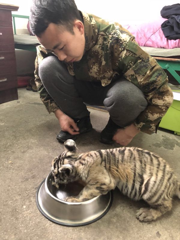 El cuidador Wang Xinyu alimenta a Bao Li, un cachorro de tigre de un mes de vida que fue abandonado a su suerte en el Parque de los Tigres de Shenyang, en la provincia de Liaoning.(Foto: China Daily/ Meng Yu/ Tan Yanzhu)