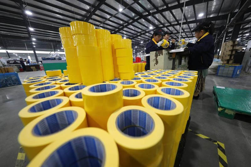 El 16 de enero de 2018, los empleados intensifican la producción de un lote de productos adhesivos de alta tecnología para enviar a Europa y a Estados Unidos en la empresa Jiangxi Yongguan Technology Development Co., Ltd, ubicada en la zona de desarrollo económico del distrito Dongxiang de Fuzhou, provincia de Jiangxi. (Fuente de la foto: Renmin Shijue)