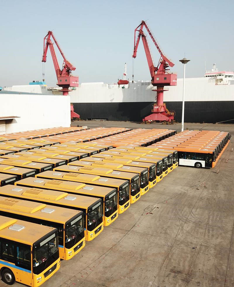 El 11 de febrero de 2018, en el puerto de Lianyungang, una gran cantidad de autobuses serán exportados en barco a los países y regiones a lo largo de "Un Cinturón – Una Ruta". (Fuente de la foto: Geng Yuhe / Renmin Shijue)