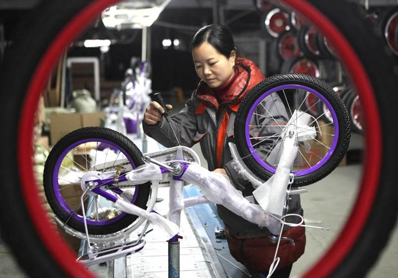 El 24 de enero de 2018, los empleados de Yihang Automobile Co., Ltd. en el condado Quzhou de Hebei, arman bicicletas en el taller. (Fuente de la foto: Hu Gaolei / Renmin Shijue)