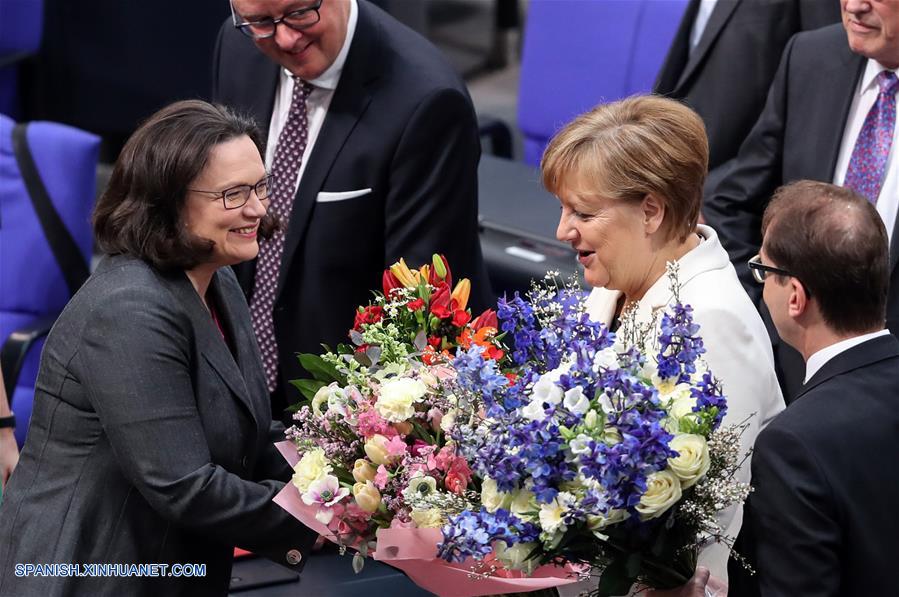 BERLIN, marzo 14, 2018 (Xinhua) -- Angela Merkel (c) es felicitada por Andrea Nahles (i), del Partido Socialdemócrata (SPD), después de ser reelegida como canciller, en Berlín, Alemania, el 14 de marzo de 2018. Angela Merkel ha sido reelegida como canciller alemana el miércoles por el Parlamento, dando comienzo a su cuarto mandato liderando la mayor economía europea. (Xinhua/Shan Yuqi)