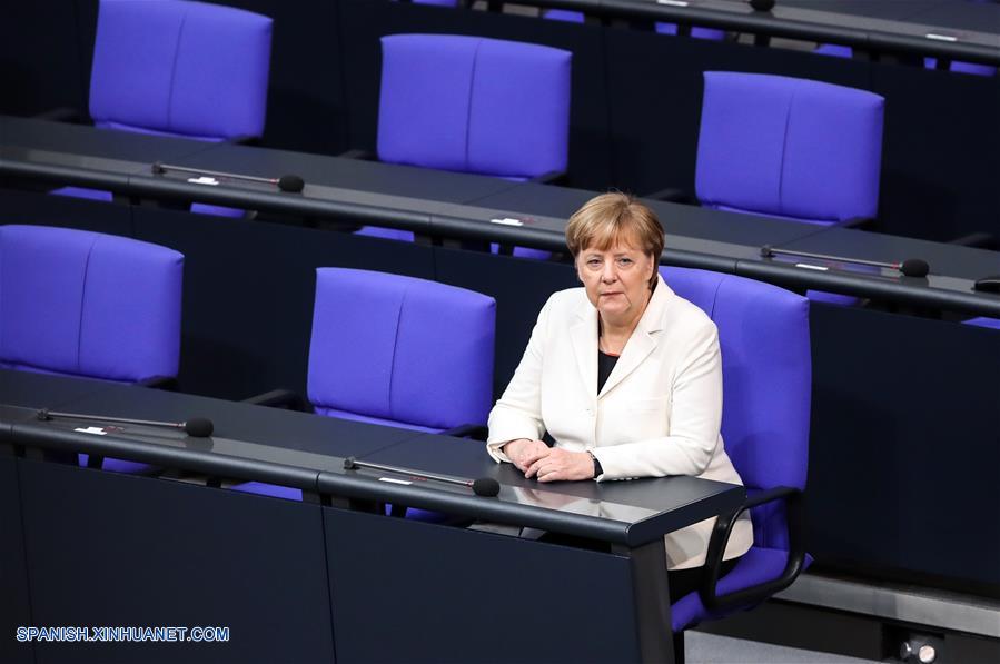 BERLIN, marzo 14, 2018 (Xinhua) -- Angela Merkel (c) asiste a una reunión llevada a cabo en el Parlamento, en Berlín, Alemania, el 14 de marzo de 2018. Angela Merkel ha sido reelegida como canciller alemana el miércoles por el Parlamento, dando comienzo a su cuarto mandato liderando la mayor economía europea. (Xinhua/Shan Yuqi)