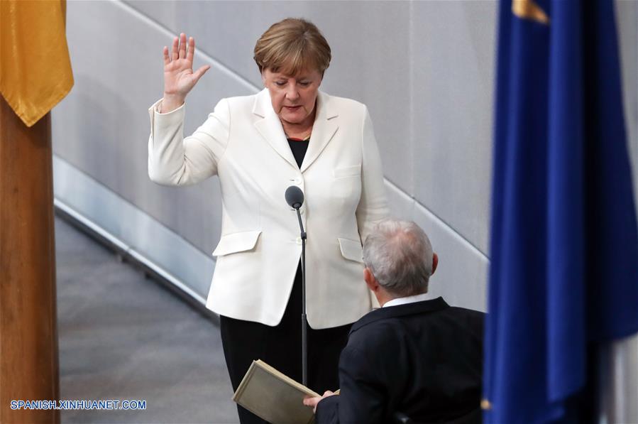 BERLIN, marzo 14, 2018 (Xinhua) -- Angela Merkel (i) rinde juramento del cargo durante una reunión del Parlamento, en Berlín, Alemania, el 14 de marzo de 2018. Angela Merkel ha sido reelegida como canciller alemana el miércoles por el Parlamento, dando comienzo a su cuarto mandato liderando la mayor economía europea. (Xinhua/Shan Yuqi)