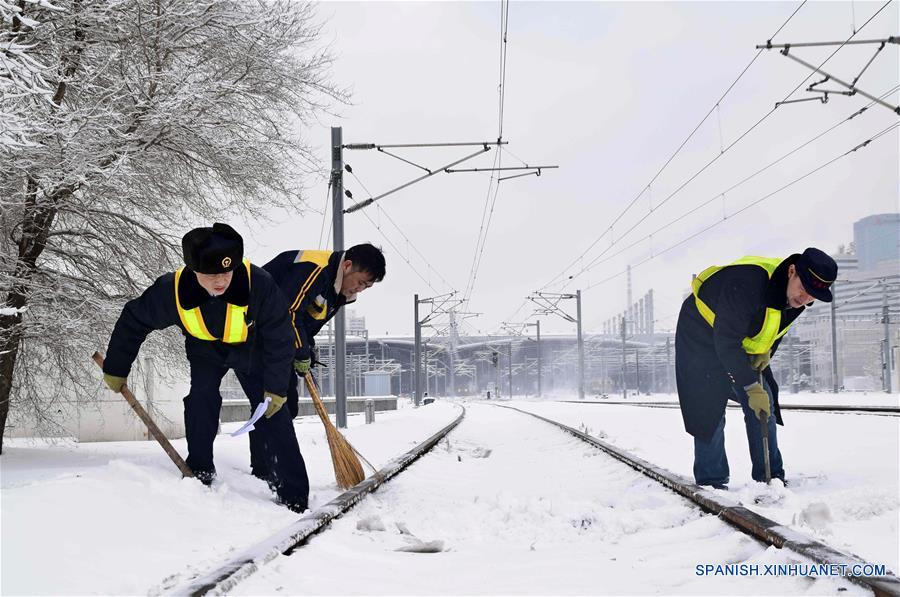 Trabajadores retiran la nieve de las vías del tren en la Estación del Ferrocarril de Shenyang Norte, en Shenyang, provincia de Liaoning, en el noreste de China, el 15 de marzo de 2018. (Xinhua/Long Lei)