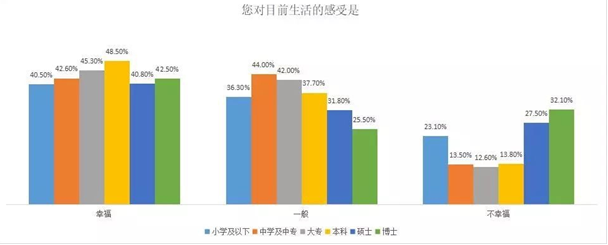 Según dicho resultado, sólo el 13,8% de los estudiantes universitarios no se siente feliz. Entre los datos de la encuesta, “l(fā)as relaciones familiares”, “el estado físico”, y “el nivel de ingresos” son los tres elementos importantes que afectan al sentimiento de felicidad. La generación post-90 de China (nacidos a partir de 1990) presta más atención a “l(fā)a relaciones familiares” que al aspecto del “nivel de ingresos”, en comparación con otros grupos de personas.