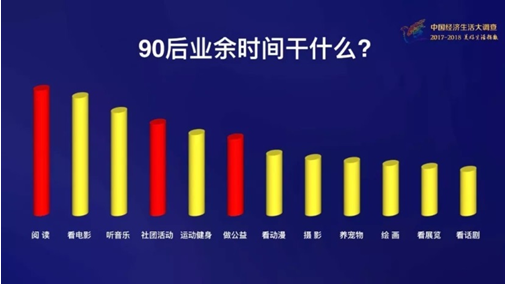 La encuesta también muestra que la mayoría de la generación post-90 cuenta con un periodo de descanso entre 3 y 5 horas al día. En cuanto a la selección de actividades en su tiempo libre, los alumnos universitarios, diferentes a los demás grupos de personas, prefieren dedicarse al “entrenamiento de aficiones” y a “l(fā)a lectura”. Hoy en día, a los universitarios les interesa y les gusta una variedad de cosas fascinantes, y además son capaces de equilibrar bien la relación entre el estudio y sus aficiones, combinando perfectamente el trabajo y el entretenimiento. Cada estudiante tiene un promedio de 4 o 5 aficiones fijas, entre las cuales son más populares el cine, la música y los juegos de ordenador. La lectura y el cine gozan de mayor dedicación.