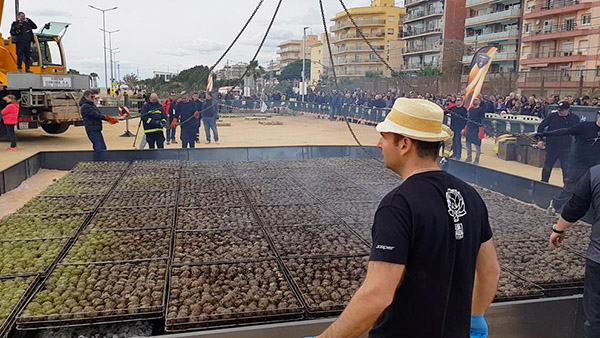 En el paseo marítimo de la localidad, un área de casi 50 metros cuadrados delimitaba un horno improvisado que albergaría más de doce mil alcachofas del Prat de Llobregat. Tras más de media hora de cocción, bajo unas planchas metálicas instaladas con una grúa, los organizadores conseguían su propósito: superar la tonelada de peso una vez cocidas.