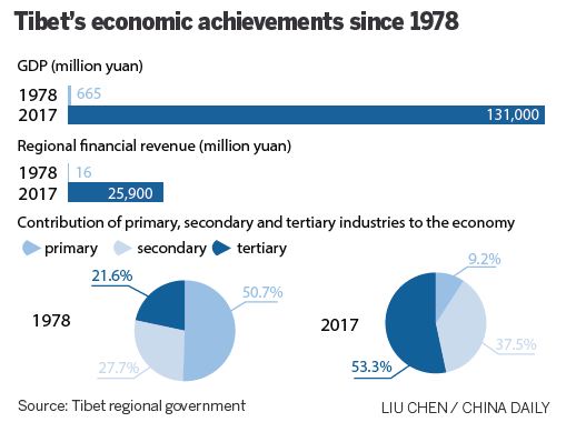 En 2017, el PIB del Tíbet creció un 10 por ciento interanual, verificando el veinticinco a?o consecutivo con un crecimiento de doble dígito. El gobierno tibetano también ha establecido este a?o una meta de crecimiento del PIB de alrededor del 10 por ciento y perfilado los objetivos en pos de un desarrollo de calidad.
