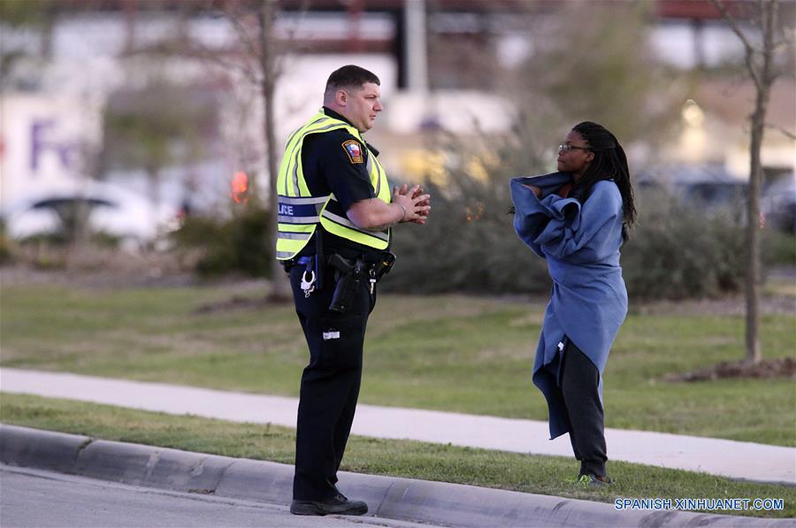 Un oficial de policía de Schertz conversa con una empleada de FedEx quien fue evacuada luego de la explosió de un paquete en un centro de distribución de FedEx, en Schertz, cerca de San Antonio, estado de Texas, Estados Unidos, el 20 de marzo de 2018. Un trabajador de la empresa de paquetería FedEx resultó herido la ma?ana del martes por la explosión de un paquete en el centro de distribución de FedEx Corp. cerca de San Antonio, a unos 310 kilómetros al oeste de Houston, en el estado de Texas, sur de Estados Unidos, informaron las autoridades. (Xinhua/San Antonio Express-News/ZUMAPRESS)