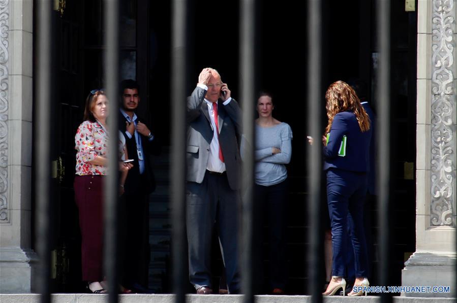 El presidente de Perú, Pedro Pablo Kuczynski (c) habla por teléfono en la puerta de Palacio de Gobierno, en Lima, Perú, el 21 de marzo de 2018. Pedro Kuczynski anunció el miércoles su renuncia como presidente de Perú, en medio de una crisis política y ofreció "una transcición constitucionalmente ordenada". (Xinhua/Luis Camacho)