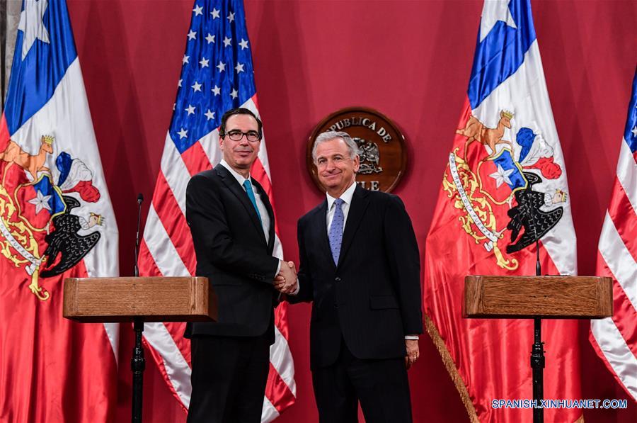 SANTIAGO, marzo 21, 2018 (Xinhua) -- El ministro de Hacienda de Chile, Felipe Larraín (d), estrecha la mano con el secretario del Tesoro de Estados Unidos, Steven Mnuchin (i), después de una conferencia de prensa conjunta llevada a cabo en el Palacio de La Moneda, en Santiago, capital de Chile, el 21 de marzo de 2018. (Xinhua/Jorge Villegas)
