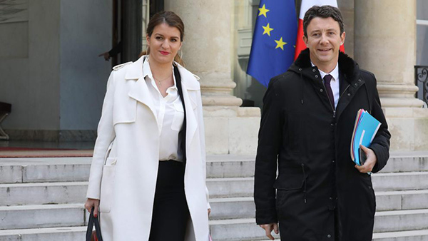 La secretaria de Estado para la Igualdad de Género, Marlene Schiappa, y el portavoz del Gobierno francés, Benjamin Griveaux, dejan el Palacio Elíseo (AFP)