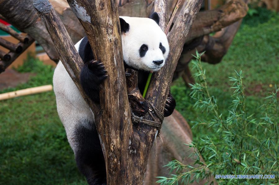El panda gigante Caitao trepa en un arbol en el Zoológico Safari Taman de Indonesia, en Bogor, Indonesia, el 24 de marzo de 2018. El par de pandas gigantes Caitao y Huchun se ha convertido en uno de los iconos del parque de animales indonesio y ha llamado la atención de los indonesios desde su llegada en septiembre pasado. (Xinhua/Du Yu)