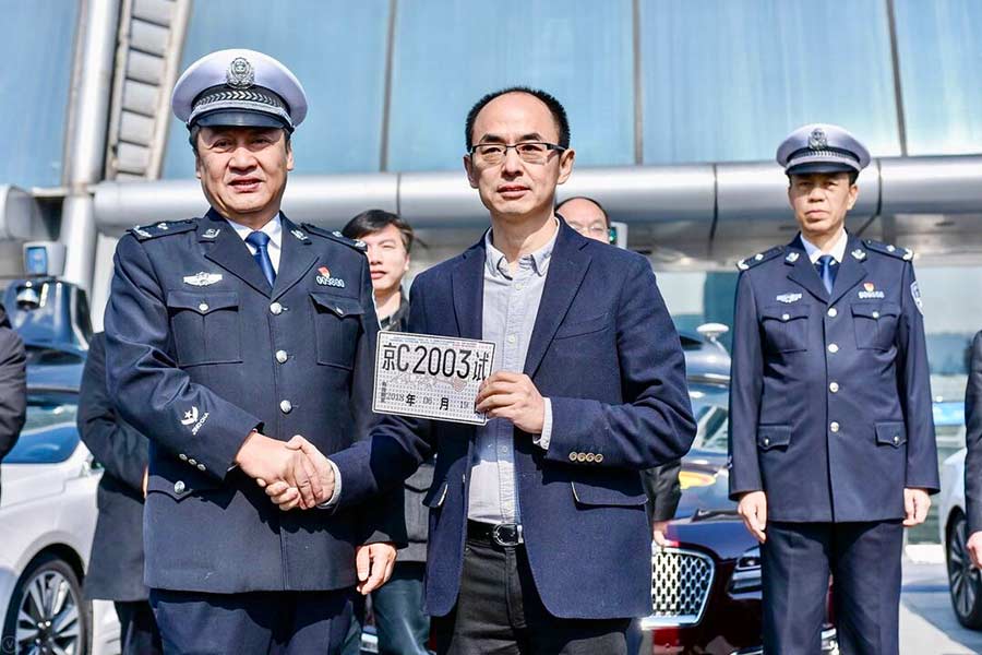 Liu Baosen, director adjunto del departamento de vehículos de motor de la agencia para la gestión de tráfico de Beijing, le entrega a Baidu una licencia de conducción para pruebas en calles abiertas, 22 de marzo del 2018. [Foto: Asiannewsphoto]