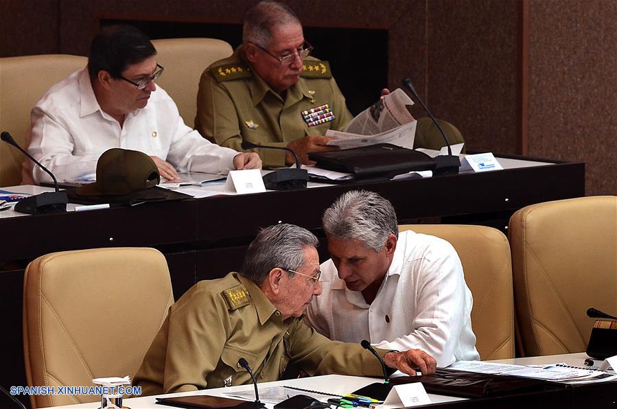 LA HABANA, marzo 25, 2018 (Xinhua) -- Imagen del 14 de julio de 2017 del presidente de Cuba, Raúl Castro (i-frente), conversando con el vicepresidente de Cuba, Miguel Díaz Canel Bermúdez (d-frente), durante una sesión plenaria de la Asamblea Nacional del Poder Popular de Cuba, en La Habana, capital de Cuba. Cuba, con la formación el domingo de los poderes provinciales, continúa el proceso que deberá concluir el próximo 19 de abril en la constitución de un nuevo gobierno y el retiro del actual presidente Raúl Castro. La constitución de las 15 asambleas provinciales del Poder Popular es el penúltimo paso de ese proceso que ahora involucra a los 1.265 delegados elegidos en los comicios del pasado 11 de marzo. Después de jurar y tomar posesión de sus cargos, esos delegados eligen mediante voto secreto a los presidentes y vicepresidentes de esos órganos de gobierno territorial. (Xinhua/Joaquín Hernández)