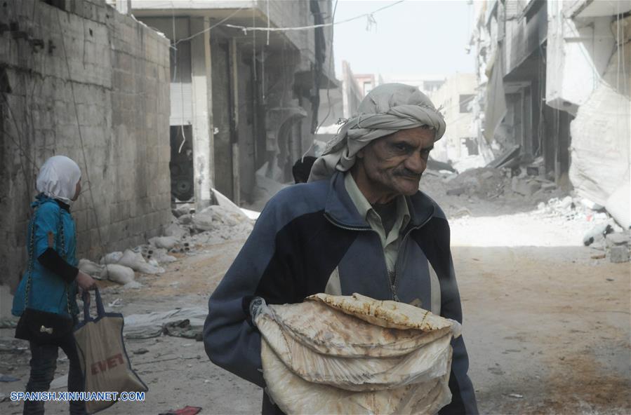 DAMASCO, marzo 25, 2018 (Xinhua) -- Imagen del 24 de marzo de 2018 de un hombre sosteniendo un paquete de pan que obtuvo de la panadería que recientemente reabrió en el pueblo de Ayn Tarma en la región de Ghouta Oriental de Damasco, capital de Siria. De acuerdo con información de la prensa local, el ejército sirio ha capturado más del 80 por ciento de Ayn Tarma mientras los rebeldes se retiran de áreas clave en Ghouta Oriental. (Xinhua/Ammar Safarjalani)