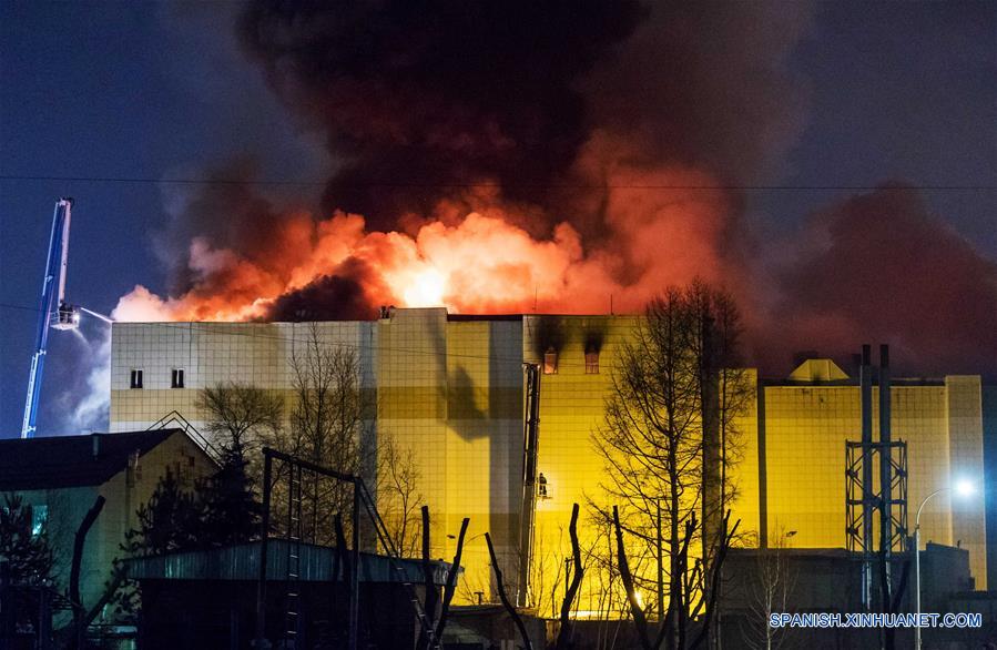 Columnas de humo y llamas emanan del centro comercial donde se registró un incendio en la ciudad de Kemerovo, en el centro de Rusia, el 25 de marzo de 2018. Al menos 12 personas murieron y 69 desaparecieron, incluyendo 40 ni?os, en el incendio de un centro comercial de la ciudad rusa de Kemerovo, informó la agencia TASS. (Xinhua/Aikin Danil/TASS/ZUMAPRESS)