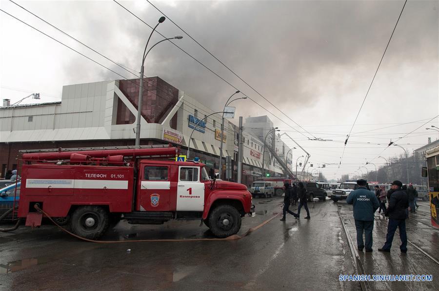 Miembros del servicio de bomberos del ministerio de emergencia intenta sofocar un incendio en el centro comercial Zimnyaya Vishnya en Kemerovo, Rusia, el 25 de marzo de 2018. Al menos 37 personas murieron en un incendio ocurrido el domingo en un centro comercial de la ciudad rusa de Kemerovo, informó la agencia TASS. Informes anteriores mencionaron 69 desaparecidos, incluyendo 40 ni?os. Los bomberos buscan a los desaparecidos en el lugar de los hechos. (Xinhua/Sputnik)