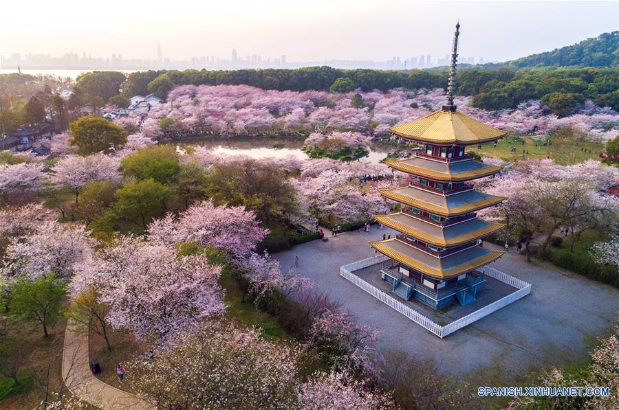 Imagen aérea de flores de cerezo en el Lago del Este en Wuhan, en la provincia de Hubei, en el centro de China, el 26 de marzo de 2018. (Xinhua/Xiong Qi)