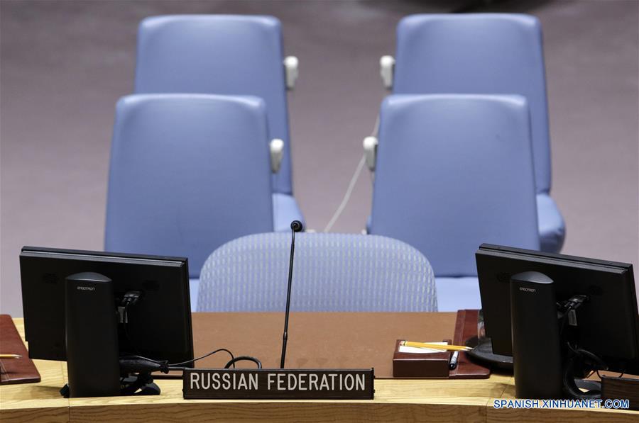 Vista de lugares vacíos correspondientes a la delegación de Rusia en la cámara del Consejo de Seguridad de la Organización de las Naciones Unidas (ONU) después de una reunión del Consejo de Seguridad de la ONU con respecto a la situación en Medio Oriente, en la sede de la ONU en Nueva York, Estados Unidos, el 26 de marzo de 2018. La Secretaría de la ONU recibió la decisión de Estados Unidos de expulsar a 12 diplomáticos de la misión rusa en la organización mundial, anunció el lunes un vocero. (Xinhua/Li Muzi)