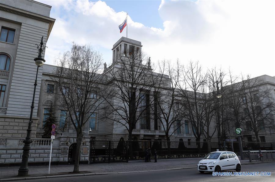 Vista de la embajada de Rusia en Berlín, en Berlín, capital de Alemania, el 26 de marzo de 2018. De acuerdo con información de la prensa local, Alemania anunció el lunes que expulsará a cuatro diplomáticos rusos en respuesta al envenenamiento de un ex espía ruso y de su hija en Reino Unido. (Xinhua/Shan Yuqi)