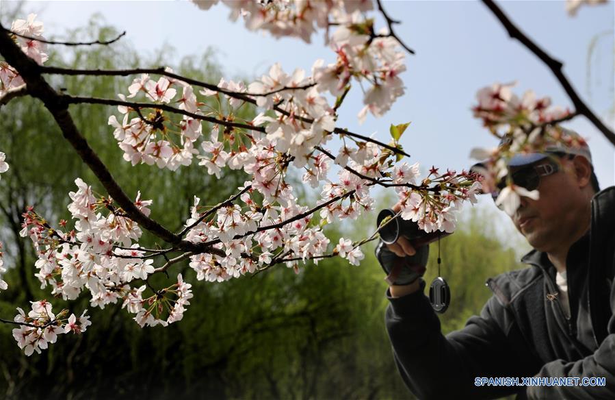 Un hombre toma fotografías de flores de cerezo en el Jardín Botánico de Shanghai, en el este de China, el 27 de marzo de 2018. (Xinhua/Liu Ying)