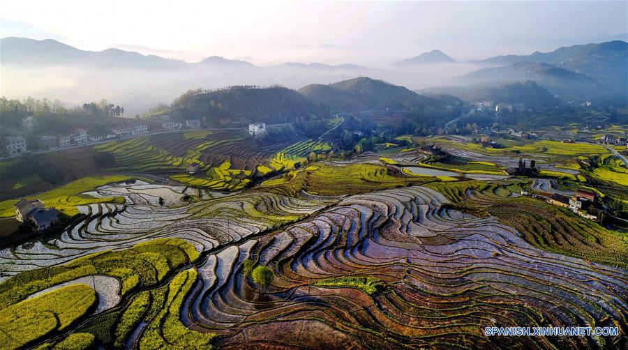 Vista aérea del paisaje de las Terrazas de Fengyan, en el poblado Xuanwuo de Hanyin, en la provincia de Shaanxi, en el noroeste de China, el 27 de marzo de 2018. Las terrazas de Fengjiang y Yanping, o Terrazas de Fengyan, que datan desde hace más de 250 a?os tienen un gran significado para el estudio de la antigua cultura agrícola china. (Xinhua/Liu Xiao)