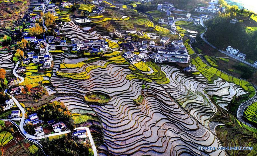 SHAANXI, marzo 27, 2018 (Xinhua) -- Vista aérea del paisaje de las Terrazas de Fengyan, en el poblado Xuanwuo de Hanyin, en la provincia de Shaanxi, en el noroeste de China, el 27 de marzo de 2018. Las terrazas de Fengjiang y Yanping, o Terrazas de Fengyan, que datan desde hace más de 250 a?os tienen un gran significado para el estudio de la antigua cultura agrícola china. (Xinhua/Liu Xiao)